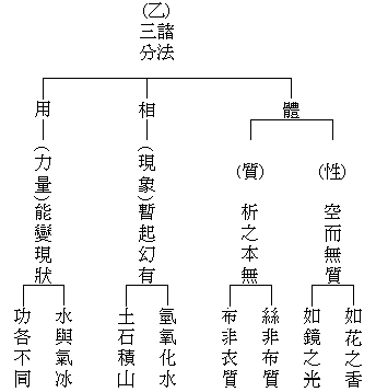 这一段提示我们研究的方法。‘诸法三分’:诸法是指宇宙人生一切法(世出世间一切法)。这是教我们在一切法里面观察,要面面俱到,不能只看一面,看一面就会发生误会,如果面面都看到就圆融。‘三分’:大到整个宇宙,小至一微尘,都有这三个部分,那就是体、相、用。它的本体、它的相状,以及它的作用,这三桩事情是一而三,三而一;三方面都能正确的理解,才将这个法看透,得到它的真相。