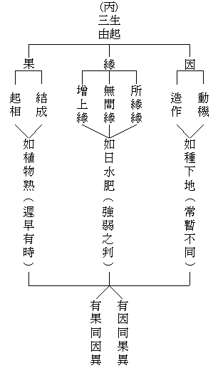 体相用里面,特别从相上下手,研究差别的现象怎么来的?‘生起三由’:现象的发生有三个条件,这三个条件就是‘因、缘、果’。这一段就是体相用三分里面‘相’的注解,就是对于相的深入观察;它有因、有缘、有结果,结果就是这个相(幻相)形成。