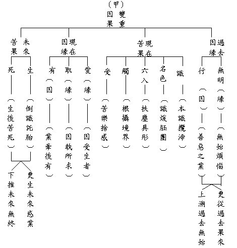 ‘双重因果’:因果是绵延不断的,有过去的因缘就有现在的苦果,有现在的因缘就有将来的苦果,所以十二因缘里面有三世,表里面列得很清楚。‘过去因缘’是过去世;‘现在苦果’与‘现在因缘’是现在世,就是今世;‘未来苦果’是未来世。过去还有过去,未来还有未来,所以佛法研修的范围是竖穷三际、横遍十方,修学内容之广泛、范围之博大,确实世间任何的学术都没有办法跟它相比。