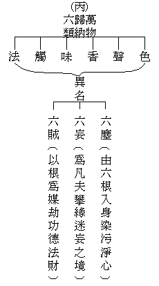 世间诸法无量无边,说不尽,佛非常善巧把它归成六大类。这六大类配合我们的六根,眼所见的都叫做‘色’,耳能够听到的都叫做‘声’,鼻可以闻到的都叫做‘香’,舌能够尝的都叫做‘味’,我们身体能够感触的都叫做‘触’,心里面所想的就是意所知的都叫做‘法’;一切万法可以用这六大类包括。