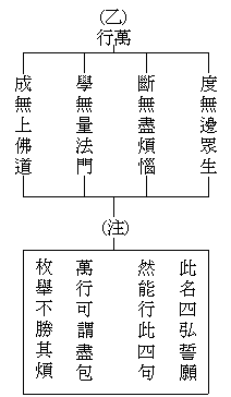 ‘此名四弘誓愿,然能行此四句,万行可谓尽包,枚举不胜其烦。’能够把这四句的意思明了,真正努力去做到,菩萨的行愿全都包括在其中。所以学佛先要发大愿,没有大愿怎么会有大行?没有大愿怎么会有真精进?所以大行、大精进,都是以大愿为基础。这是把大乘佛法―‘菩萨乘’简单的介绍出来。