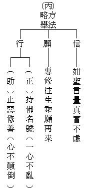 功夫上的要求,每一声佛号都要具足信、愿、行;这三个条件,是修净土的三资粮,资助你往生西方极乐世界。佛号里真正具足信、愿、行,你的心一定是清净的,决定是上善之心,不会有一个恶念,自然就能与西方净土相应。至于念法,念六个字、念四个字都可以;大声念、小声念,出声念或者是默念,随自己方便,你觉得哪一种念法念得很得力、很相应,就可以用那一种方法念,没有一定的。有人佛号念得很快,有人念得很慢,能念到一心不乱就是好的念法。不管你用什么方法,能念到心地清净就好。真正念佛的人,佛像就供一尊―阿弥陀佛。为什么?求一心不乱。经本就一本《弥陀经》或《无量寿经》,专一;其他的什么都不要。古来大德,专修净土都是如此。印光大师,他的房间里面,就是一尊佛像、一个香炉、一本经书、一个蒲团。除此之外,一个‘死’字挂在旁边,一天到晚看到,我快要死了,赶紧念佛,所以功夫能成就。印光大师是我们的榜样。莲池大师说:三藏十二部,让给他们去悟;八万四千法门,饶与别人行。你们去行去,我是专门念佛;搞别的法门,一定耽误自己。古德常讲:‘但得见弥陀,何愁不开悟!’所以,一句佛号念到底,什么都不求,只求临命终时,阿弥陀佛来接引,就行了!甚至于品位高下,统统不要管,不要去跟阿弥陀佛谈条件,这样才能够成就,才能真正念到一心。