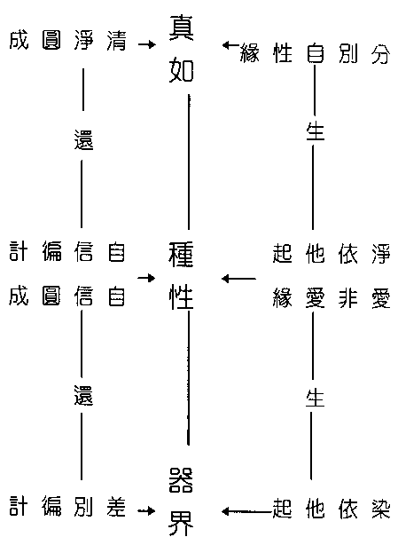 三自性。各有真似两种。真如。真圆成。种性。似圆成。似圆成。即小乘圣果。真圆成。是佛果故。种性。真依他。器界。似依他。器界假名无实。无所起故。器界。真遍计。种性。似遍计。种性是一。无所谓周遍故。此三自性即一法。从生起而名依他起。从所缘而名遍计执。从还灭而名圆成实。舍似从真故。各有专名。古德于此三自性。种种揣测。未得真象。学者无所适从。特表示之。(名义出摄大乘论。)