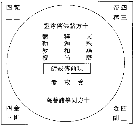 前面曾说过,受持净戒不是容易的事,尤其是求上品戒。忏罪之时,必须请十方三世诸佛证明加被,这便应知受戒坛场的布置是怎样的仪式。正中应供奉释迦牟尼佛为菩萨戒和尚( 得戒和尚 ),在上首应供文殊菩萨为净戒阿^黎( 羯磨和尚),在下首应供弥勒菩萨为清净教授师( 教授和尚 ),并请十方诸佛为尊证,十方菩萨为学戒伴侣,四天王、八金刚为外护众。不但要以上的诸佛菩萨为加被,还要请现前的传授师亲为传授,这是受戒仪式的设置。今作一‘菩萨戒曼怛’于此。