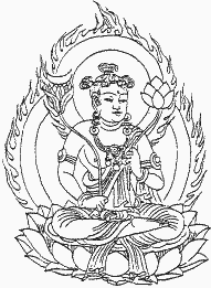 七、瑚底罗大将――此大将的本地为虚空藏菩萨,是午时之守护神。通身赤色,现忿怒形,头戴马冠,右手把三股戟,左手持螺具。