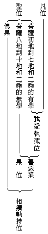 (2)三位:这第八识,从凡夫发心到圆证佛果,由于断证有异,因此第八识的名义亦有三位的差别:一、我爱执藏现行位。即七地以前菩萨、二乘有学、一切异生,从无始来,名阿赖耶,此云执藏。至无人执位,这阿赖耶的名称就舍掉了。二、善恶业果位。即从无始至金刚道时,乃至二乘无学位,名毗播迦,此云异熟。至无所知障位,第八纯善无漏,这异熟识的名称也就舍掉了。三、相续执持位。即从无始乃至如来,尽未来际利乐有情位,名阿陀那,此云执持。执持种子根身等,永无弃舍。总起来说,七地以前的菩萨,二乘有学圣者,及一切异生,这第八识的三名完全具有。菩萨八地以上和二乘无学,我执伏灭永不现行,阿赖耶的名称便舍去了,只有后二位的名称存在。到了佛果位,二障种习都已永尽,刖只有阿陀那一名存在了。这里把三位的宽狭立表如下(表四):