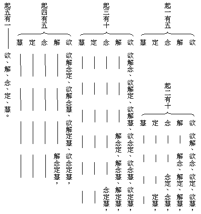 (1)独生俱起。这别五所,有时只起一个:即于所乐境,唯起希望。于决定境,唯起即解。于曾习境,唯起忙念。于所观境,唯起专注。(有类愚昧的众生,为了止息散心,虽然专注所缘,但不能起简择的智慧,所以有定无慧。)于所观境,唯起简择。(即不专注,驰于散乱的推求。)或时起两个:即于所乐,决定境中,起欲胜解。于所乐、曾习境中,起欲及念。如是乃至于所观境中,起定及慧。合有十个二数。或时起三个:即于四境起三数。于所乐、决定、曾习境中,起欲解念。如是乃至于曾习、所观境中,起念定慧。合有十个三数。或时起四个:即于四境中,更互除去一种。于所乐、决定、曾习、所观境中,起欲解念室前四种。如是乃至于决定、曾习、所观境中,起胜解念定慧后四种。合有五个四数。或时五个俱起:即于四境上,合起五种,于所乐、决定、曾习、所观境中,俱起五种。如上所说,五个心所,一一别起,到俱起五种,总别合有三十一句,列表如下(表七):