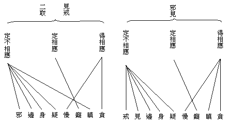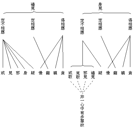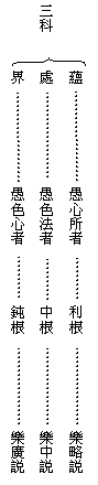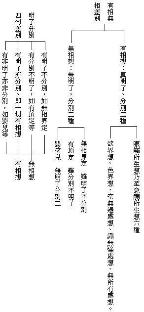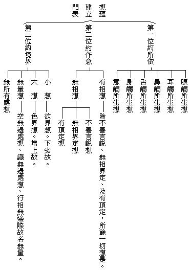 (三)无色界:无明支中,唯有胜义愚,有覆无记性。行支中,唯有不动行,唯有意业。识支,唯是化生天趣。名色支中,唯有名无有色。名中又无五识。六处支中,唯有意处。触支中,唯有俱相违触。受支中,唯有舍受。爱支中,唯有有覆无记性。取支中,概摄一切烦恼,在根本烦恼中,唯有九种,除去嗔心。随烦恼中,除小七(忿、恨、覆、恼、嫉、悭、害)中二(无惭、无愧)是不善性,唯欲界有故。诳、谄通欲界及初禅,x及大八通三界。故随烦恼中,唯有x及大八。有及生老死,准色界可知。