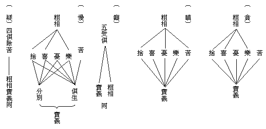 (3)五受俱起。欲等五所皆与五受相应。欲既是于所乐境希望为性,怎么会与逼迫性的忧苦二受相应呢?因为修习圣道的人于无上法思慕憾求欲证,即善法欲与忧受俱起,由此证知余时亦得相应。纯受苦处,希求解脱彼苦,故欲与苦俱。并且对注《瑜伽》第七、卷五十九卷皆说贪与忧苦受相应,贪爱俱起,必有欲数,由此亦可证知欲与忧苦必然相应了。