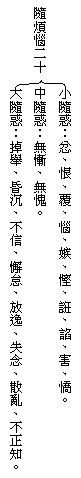心所法总有遍行五、别境五、善十一、烦恼六、随烦恼二十、不定四等六类,共五十一个,如表(表五):