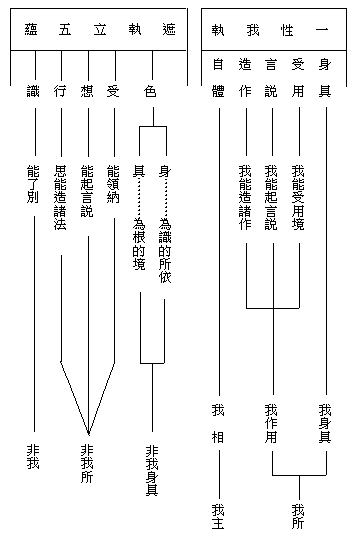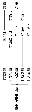 又一切众生,由于无始以来的内在和外诱的实执习气的熏习,计执诸法为实有固性的自体,起人法二种我执。我你他、情非情,一切的一切,凡所见闻者,莫不以为有独立的我法自性。由这种妄执,起惑造业,流转生死,不得解脱。但是观察这包括一切法尽的五位法类,无论为事为理,或各别的单位,积聚的总和,以理推证,都找不出如众生所计执的固性我法的自体。所以明白了五位百法,也就能够从道理上通达人法二种无我的意义。这里分别地解说如下:
