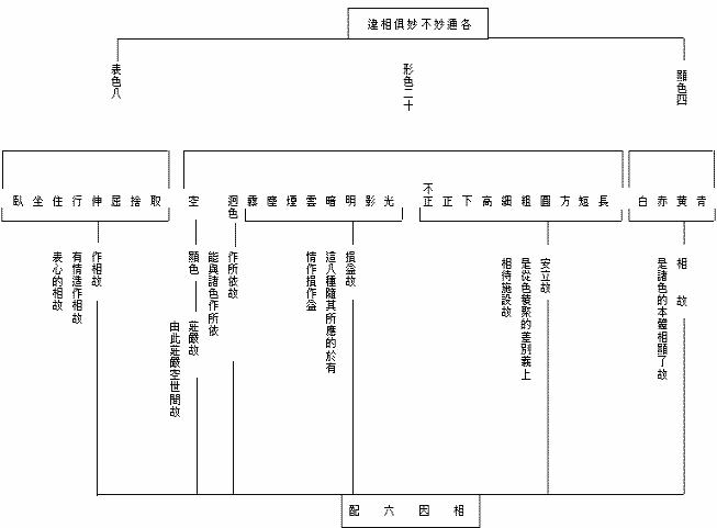 五、色非色门:十二支中,无明、识、触、受、爱、取六支,唯是心法,不通色法。其余六支,通色心二法。行支通三业,意业是心法,身语二业是色摄。名色支总括五蕴,心色全具。六处支通二蕴,五根名色蕴,意处即识蕴,行等六支,转名有支,故有通色非色。五蕴现行名生支,五蕴衰变名老,五蕴坏灭名死,故生老死皆通色心。