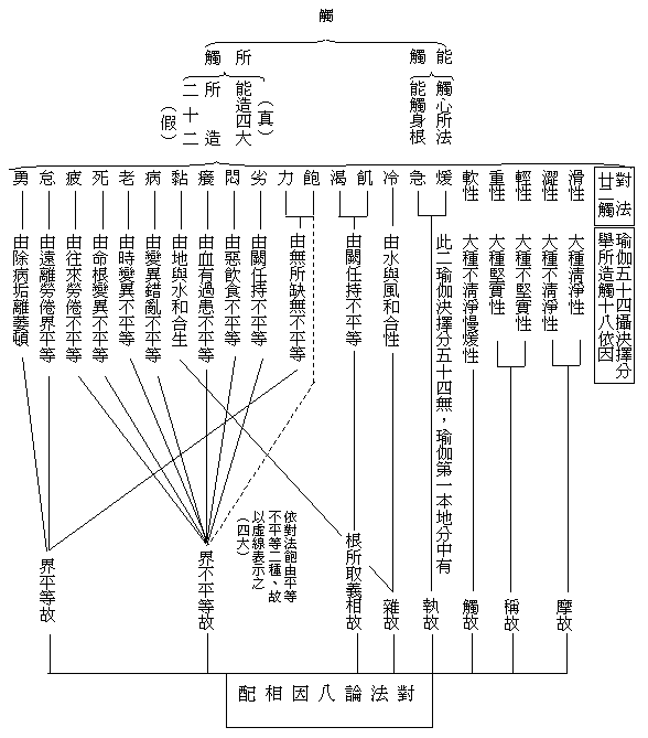 六、触支,触是遍行心所之一,即出胎后由根境识三和合而生起的触。这触有两种:(一)无明相应触,(二)明慧相应触。唯取无明触立支,明慧触非流转生死法故。