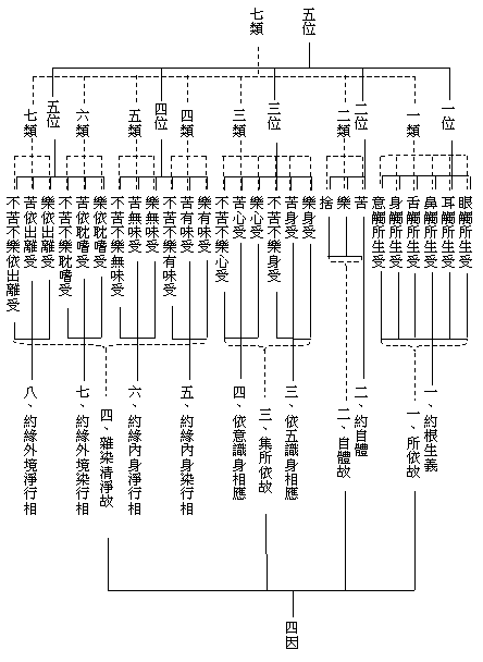 十四、三苦分别门:十二支中,除老死支,余十一支少分坏苦所摄。本来十二支通有苦苦、坏苦、行苦,这里除苦苦、行苦,唯取坏苦,故说十一支少分。为作么除老死呢?因为老死位中,多分无乐受,依乐立坏苦,故不说彼老死支中亦为坏苦。十二支分苦苦所摄,一切支中有苦苦故。十二支全分行苦所摄,诸有漏法,皆行苦故。又依三受门舍受说行苦,除老死支,余十一支少分是行苦。除老死支的理由是:老死位中多分无舍受,故不立彼为行苦。这里与老死位中多分无乐受,不立彼为坏苦的道理一样。
