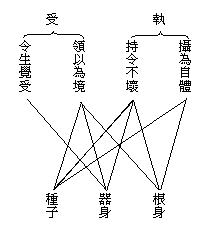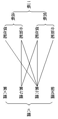 (八)阿赖耶识:阿赖耶识是梵语,华言藏识,有能藏、所藏、执藏三义。能藏即第八识能含藏前七转识诸法的种子;种子是所藏,第八识即名能藏。所藏即由前七转识熏习诸法的种子在第八识中;诸法是能藏,第八识即名所藏。这就是约第八识的受熏义边名所藏,约持种义边名能藏。执藏即第八识恒常被第七末那爱执为自内我体,故名执藏。由第八识具有三藏的功能,所以第八得名藏识。