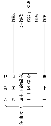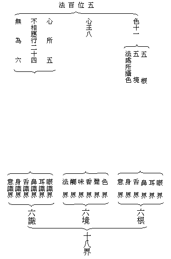 学习佛法的第一个困难,就是为不了解名相的含义所障碍,并且法相名词多以万计,更不容易从各个名相之间得到系统的认识。但是我们假若能够从某些有系统性的名相去学习,而弄清楚其意义和联系性,也很容易克服这一困难。大小乘的论典中,多以心、心所、色、不相应行、无为五位法来作为说明和统摄一切法的规范。如小乘的《俱舍论》以五位七十五法来说明和统摄一切法。(色法十一、心法一、心所有法四十六、不相应行十四、无为法三。)《成实论》以五位八十四法来说明和统摄一切法。(色法十四、心王一、心所四十九、不相应行法十七、无为法三。)大乘法相宗,以五位百法来说明和统摄一切法。这里举出大乘的五位百法来作一简单地介绍,就可以知道佛典中所说的一切法的基本意义和系统了。
