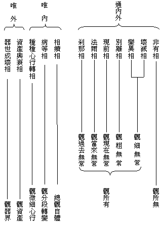 (1)三相:三相即自相、果相、因相。自相即阿赖耶。具有能藏、所藏、执藏义故;此即显示第八识所有自相。果相即异熟识。此识是能引诸界趣生善不善业的异熟果故,说名异熟;此即显示第八识不共的果相。因相即一切种子识。此现行识能执持诸法种子令不失故,名一切种;此即显示第八识不共的因相。自相即自体义,在三种藏中,执藏义的过失最重,故以阿赖耶显示第八自相,是特约执藏义说。因为第八识的自体上具有因果二义,为了显示第八识体上有此差别义,所以《成唯识论》里建立第八识三相的差别。问:‘能藏即因义,所藏即果义。因果之外,岂更无别体吗?’答:‘自体是总,因果是别;总为别所依,别为总所包。包二为一,以总摄别,自相即摄持因果二相为自体故。’‘若这样说来,自相应是假有了?’答:‘这却不然!若有条然的因果两相合为自相,刖自相可成假有;这因果相即第八识自体上的别义,故非假有。’