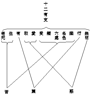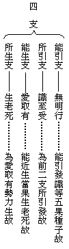十二有支,在远近因果,和已润未润的因果关系上,诸支相望。《缘起经》、《瑜伽论》、《对法论》、《成唯识论》等,皆略摄为四支:一能引支、二所引支、三能生支、四所生支。
