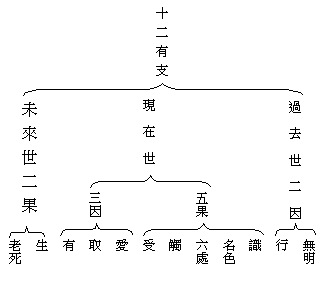 总上所说十二有支,在小乘一切有部论中,都是以五取蕴为体,建立为三世两重因果。无明、行两支,是过去世的惑业,为招感现世识等五支果法的因,故无明行是过去二世。识、名色、六处、触、受,是由过去世无明行所招感的现在世的五支果法,故识等五支,是现在五果。这是一重因果关系。爱、取、有三支,是现在世的因,爱取是烦恼,有是业行,现在世中由爱趣有起惑造业,为招感未来世苦果的因,故爱取有三支是属于现在世的三因。生老死二支,是由现在爱取有决定招感的属于未来世的苦果支,故生老死是未来的二果。这又是一重因果。如是十二有支,就成为过去、现在、未来,三世两重因果。列表如(表四十三):