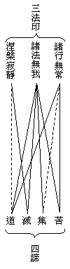 这三法印,是苦集灭道四谛变相的收摄,诸行无常,是苦谛;其生苦之因即集谛;涅寂静即灭谛;其证灭之因即道谛。无我则贯通四谛。如《大智度论》二十二卷说:‘佛说三种实法印,广说则四种,略说则一种。无常印是苦谛、集谛、道谛说。无我则一切法说。寂灭涅,即是灭谛。’立表知(表四十八):