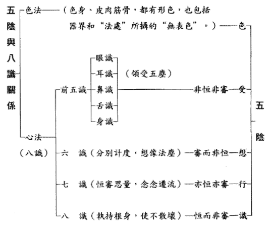 凡是考查过、学习过和听到过的问题,往往很容易忘记,若一查再查,势必浪费时间精力,因此最好备一手册,将常见的名相等,根据自己需要,做好精要的摘记,不必过细,只要便于检查翻阅就是了。此外绘成表解,也很重要,可以帮助了解和记忆,例如:将五蕴与百法的关系、三界六道的系统、四谛十二因缘的开合、五阴与八识的关系等绘成图表,可以一目了然,温故知新。例如:(见附表一、二)