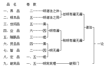 《阿毗达摩俱舍论》,意译为‘对法藏论’。对法是指‘发智本论’而言,这有二种意义:一、是对向涅义,二、是对观四谛义。现先述‘本论’的组织如下: