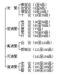 如上表成实一论的组织,分为五聚二百二品。发聚是解释三宝,而其次的十论是说明作论的目的。本论对于苦谛聚即以五阴来说明,集谛是详述业和烦恼的部分,由此可知苦、集二谛聚不外是阐明世界的现实和原因的了。灭谛聚是涅的说明,其中所立之‘假名心’、‘法心’、‘空心’为成实论特殊的教理。最后的道谛聚和灭谛聚同样,由大体上分为‘智’和‘定’二种,这是说明证果的原因的部分。