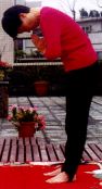 在学拜中,常常抓不到要领―不知重心要在足跟,才合乎物理之自然重心。开始也不会用丹田之力躬身、退腹,连垂头看脚跟中点都不自然―不知俯首垂头要用自然力柔软垂下,只会猛使力,结果矫枉过正,又弄得脖子很酸!