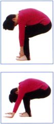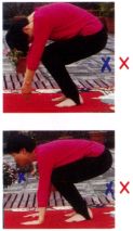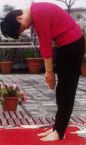 这动作大概是大多数人最有问题的一个动作。要点是曲膝往下蹲时,重心要放在二个脚跟间的中心点上,也就是完全用二个脚跟做著力点直到双手能按地。小腿要保持正直,初学时,很难做到,要不就小腿倾斜,用脚掌著力;或臀部蹲得不够低;或中途头仰起、颈僵;再不就合掌的二手向前斜著出去超出脚底面积,而致重心不稳;也有重心向后超出了脚后跟而坐倒在地的情形。屡试屡败,甚至还起一心念认为这个动作是否违反力学原理,根本做不到吧!其实,这个心念是最致命的障碍,杀伤力最大。学佛学不好,也往往就是由于这种要命的‘自以为是’的念头。好在,我对法师有大信心,放轻松,反覆练习,目前不能说做得很标准,但可以很轻松地做这个动作。确实,在小腿垂直,脚跟著力的情况下,膝腿最不费力气,拜久了也不会伤到膝盖。
