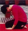 蹲下后,二手前伸触地,稍用力撑住,膝盖就往下跪,跪下后,两手和两膝在地上成一直线。我以前的拜法是两手超两膝前约十五至二十公分,跪下时是两膝在后、两手在前,用两手来支撑一部份身体的重量,因此两只手腕受力不小。刚开始,学两膝和两手成一直线往下跪时,总不对劲,总不顺畅,总觉得‘是不是把讲义看错了?’,看了好几次,没错,就坚持照讲义去拜,大约一个月就顺畅了,能很自然地做到。也体会到,这种拜法,减少了二只手腕的受力,手腕不会因拜久而不适。
