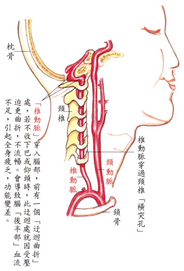 四、神经方面:头、颈部神经密布,非常复杂,以应付日常生活种种需要。(若受压迫则有病变,请参考下页附表一)而神经之营养,仰赖‘血流’供应,而脊髓血流又和‘椎动脉’之供应有关,当血流供应受阻,神经即使不直接受压,亦间接失去营养滋润。加上肌肉紧绷(压力大),神经传导亦受影响。此在轻微的抬下巴,影响较小,若仰头(尤其长期僵持性仰头太甚)则有较严重之直接压迫。(容后再述)