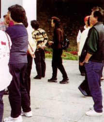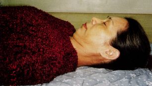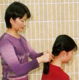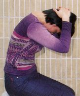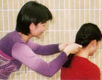 ←双手交叉,轻松放在头(枕骨)后方,垂头、放松。以手之重量,载于枕部,调整拉开头、颈之关节,(枕寰关节),及颈椎各节。 |