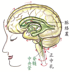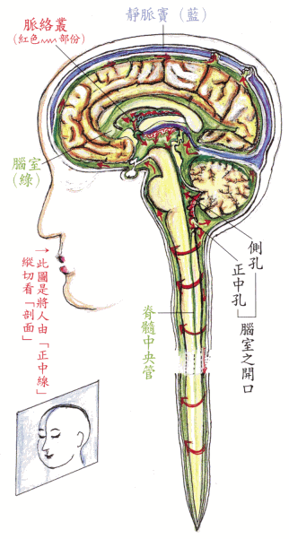 (图中以草绿色表示脑脊髓液) (红色箭头表示其流动方向) |