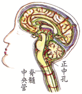 *如下图,以纵剖面看脑部,可见藏在其中的‘脑室’构造及‘脊髓中央管’,以及由‘脑室’之开口,循行到整个脑脊髓外层的‘脑脊髓液’。