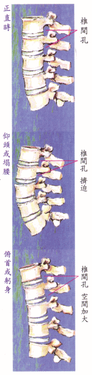 俯首: 则脊椎各节后边,如扇状展开,由上下二凹所合成的‘椎间孔’也较开,空间大―压力小,故通过其中的血管通畅,神经舒畅。 |