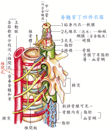 将脊椎骨之后部切除,以便观察贯穿在整串椎骨中的‘脊髓’,以及由各节脊髓分枝出来的‘神经’―左右成对,由‘椎间孔’穿出。分布到全身各部位(包括内脏和四肢)。注:肱音ㄍㄨㄥ
