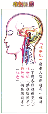 ・椎动脉先天上就有迂回曲折,加上人们平日抬下巴,仰头工作,常使头骨(枕骨)和第一颈椎的间隙(枕寰关节),变得狭窄,而压迫到这本就迂回的椎动脉,使进入脑部的血流减少,缺氧―脑功能日渐衰退。不但会引起头痛、头晕、昏沉、情绪不稳、焦虑不安、失眠,也会引起血压之升高,内分泌失调(月经不顺)。