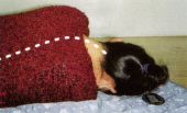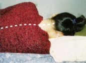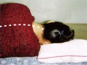 侧卧时,枕头之高度,对‘颈―胸椎’角度,影响甚大,若角度不对,一夜睡卧,连续压迫数小时,不但血流不通,易做恶梦;也由于脑和脊髓,供血不良,会波及全身,发生严重影响。请注意:各图中脖子的‘斜度’。(枕头高度不同)