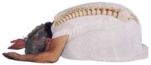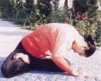 拜佛之动作由躬身―五体投地,脊椎拉开、放长之程度(由背后中线量)可长十多公分。(间隙拉开、拉长) |