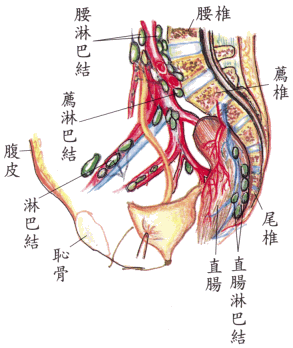腰荐淋巴结 主要显示出在腰椎、荐椎前面的大血管(红色―动脉,蓝色―静脉)和淋巴结(绿色) |
