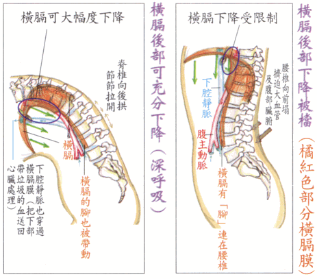 ・腰椎前塌:障碍‘横膈膜后半部之下降,也障碍‘肺’之膨胀,故呼吸短浅。 |