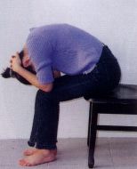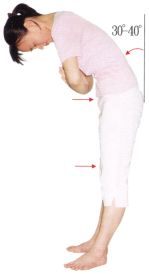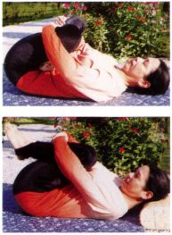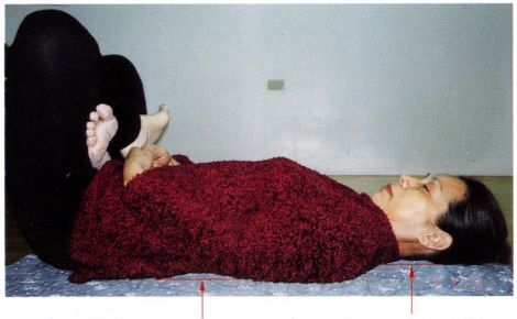 收下巴后―若颈椎与床,仍距太远者,多有头、及肩手疾患,打坐也易上火,须多拜佛调整。 若腰椎,不能密贴者,打坐腿易酸痛麻,(坐骨神经受压故) ・宜多拜佛调整。 ・可以用手扳住膝―使大腿贴腹―然后放松―深吸气,反覆多作几次,拉开腰肌,即可调整。(图见上面) |