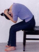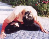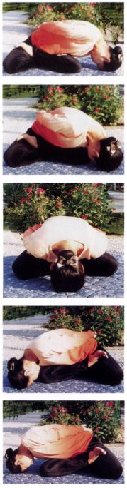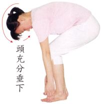 盘腿―垂头、弯腰―放松颈部腰部(向左右侧亦然)。使坐时,身能‘正而松’,(注意:趁吸气,坐直起来)