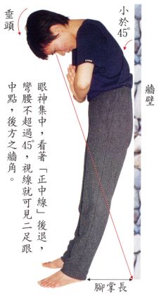 (1)立于离墙壁约一脚掌长之处,胸、腹、腿一齐退后,使‘腰背’能贴墙。(非‘臀贴、腰不贴’)。小腿向后斜。 |