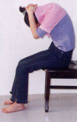 以手轻松,载于后脑部,藉自然重力、拉开颈椎,(手的位置稍移动,可拉开不同的筋脉) |