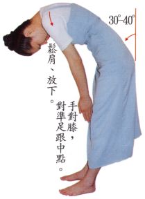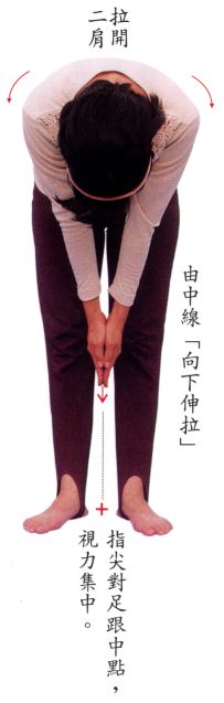 ・若不配合俯首,拉开颈椎及胸椎,舒活神经,则长期压迫,不只肩会酸痛,连手臂、手指亦会酸、麻、痛。若能俯首,拉开颈椎,则可改善。故此动作之要领,是要在垂头状态下,松肩。