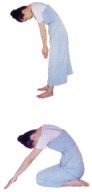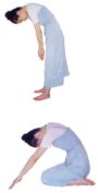 ・将肩自然松、落(如掉下般),又合掌下垂于中线(端正而松柔),合掌之手,沿中线,再往下伸拉一些,(上身不动,肩、肘松),可将二肩胛骨,拉得更开阔、更舒服。使平日已紧绷缩短的肌肉,韧带都拉长,拉松。