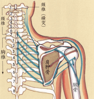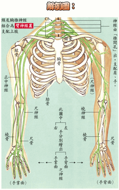 ・由右图左右手,可了解整个上肢神经,追溯其来源,是由‘颈椎’(4、5、6、7)及‘胸椎’之间的‘椎间孔’出来(会合为臂神经丛)。亦即颈椎第5、6、7、8对神经,和第一胸椎的神经,支配肩部和手,而平日仰头之动作常会压迫这些神经,故造成肩酸痛、手麻、无力。