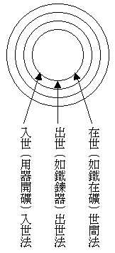 以上说的这三类众生,与处世间的状况,也有一个比喻,第一类凡夫困在世间,为尘沙缠缚,如铁在矿。第二类声缘,超出世间,如出矿之铁,锻炼成器,已不再受尘沙的缠缚了。第三类菩萨,出世而能入世,如持铁器向矿里去开发,以将矿里的铁尽掘出来为志愿,是出世不贪著涅为乐,入世亦不为欲尘所染,如图所示。