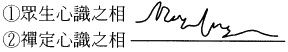 解释:于明空之心性,当下承当,离一切增益;即是‘大手印决定见’。此与中国禅宗所唱,当下即是,不可头上添头,完全一鼻孔出气。修大手印,只要不忘失此当下明空惺寂之一念,勿散乱即得,别无巧妙神奇之其他修法。于行住坐卧,日常动静中,不离这个,就是最殊胜的‘行’。这就是大手印的见、行、修三要!